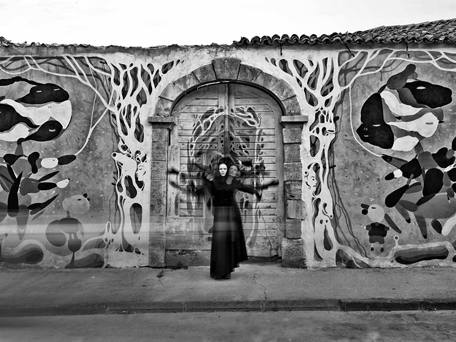 With 11 pictures - oversized printed - Matteo Cardin investigates the mysteries of Vodnjan-Dignano and accomplishes a reverse and heretic inquisition in which photography becomes sacrilegious exaltation and magical action. The camera's eye passes the city going through the immobilized streets, the alleys, the squares and it questions the static silence of urban space, interrupted by wizardries of characters, stories and colors imprinted on huge, imposing facades. The black and white is the detector filter with which the photographer/inquisitor intercepts the oozing spirit of the city, the ectoplasm that takes the shape of a lady in black, intense, ethereal and intangible, solid and vaporous. A dancing entity, coming out from the vacuum, from the orifices of the time, from the cracks of the ruins to verify the death of death; to verify and celebrate the accomplished sacrilege».